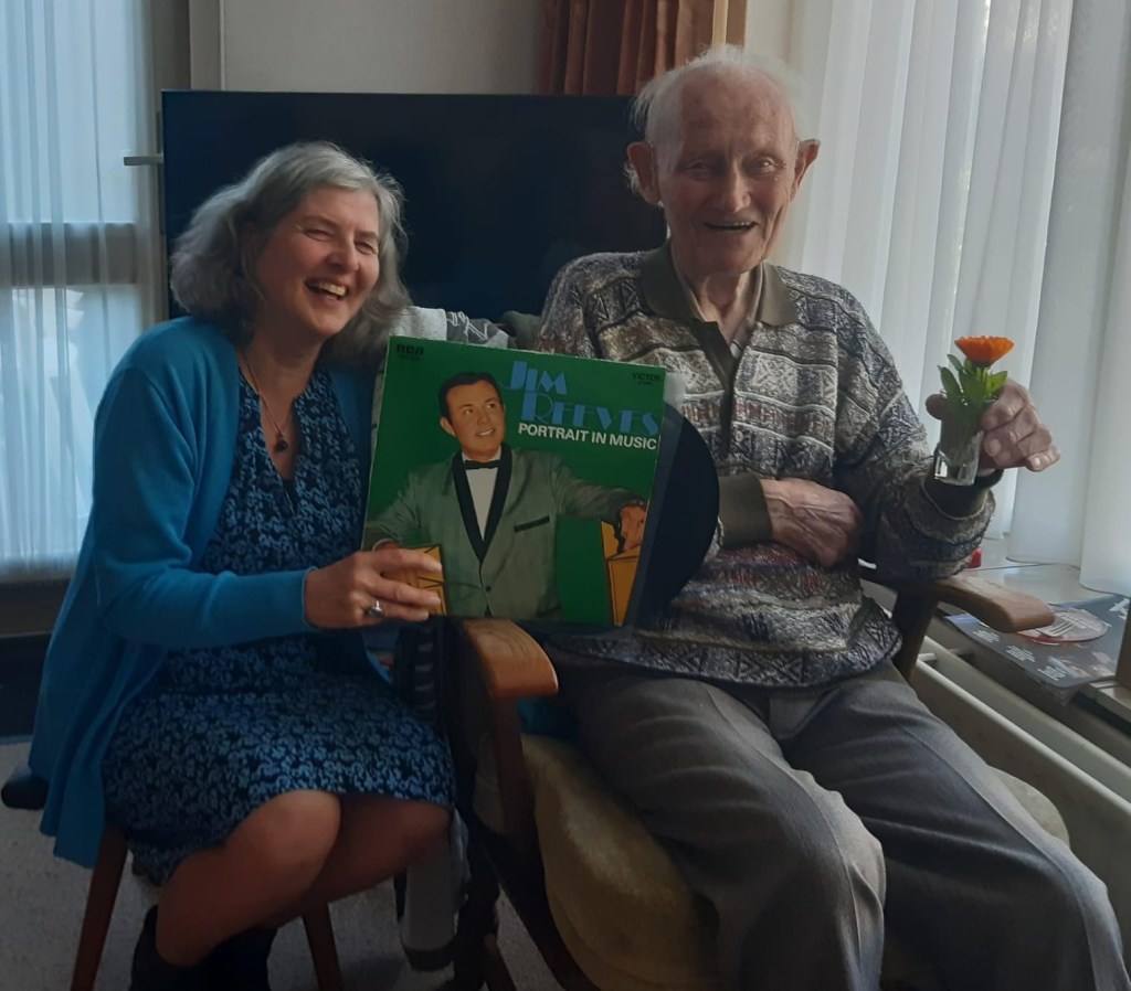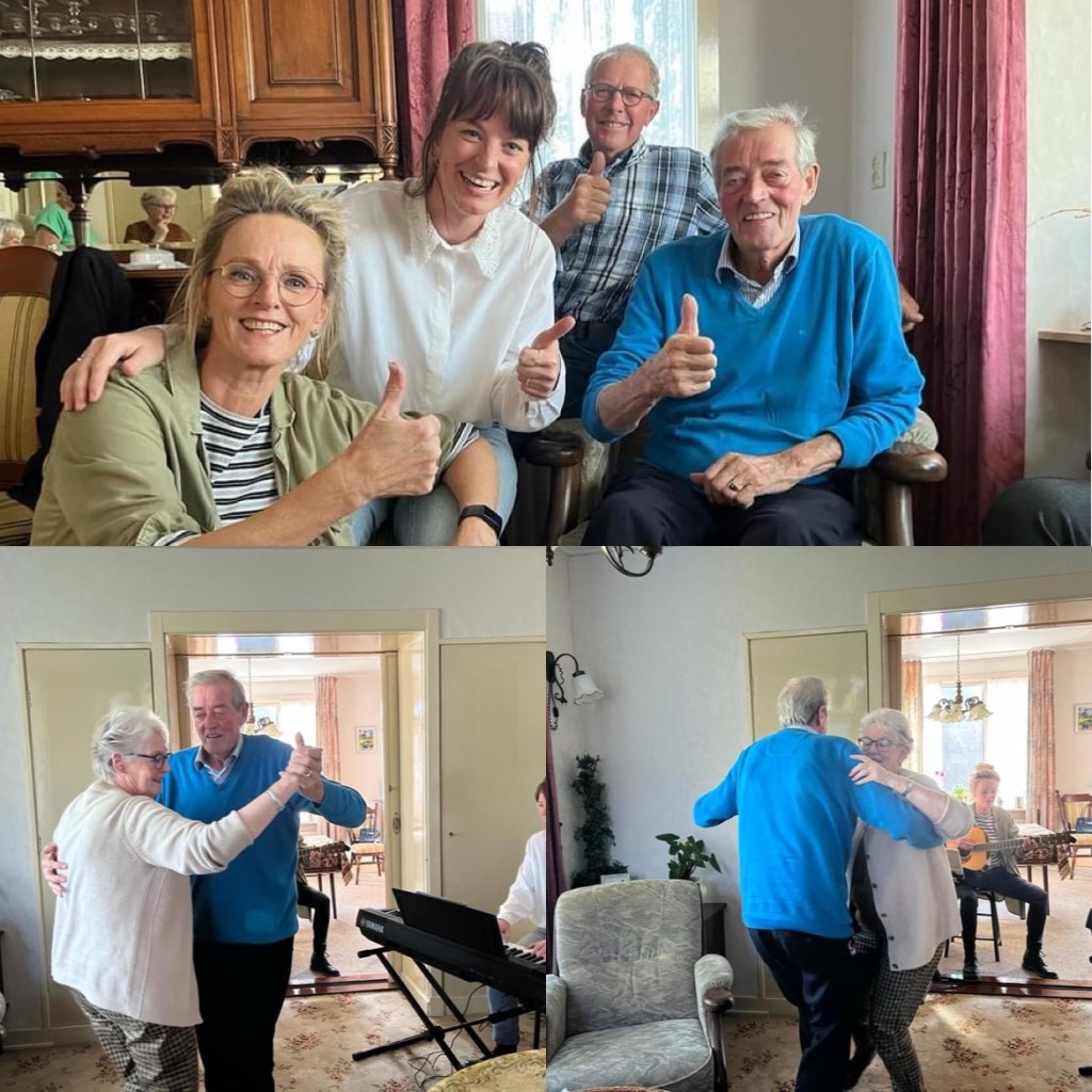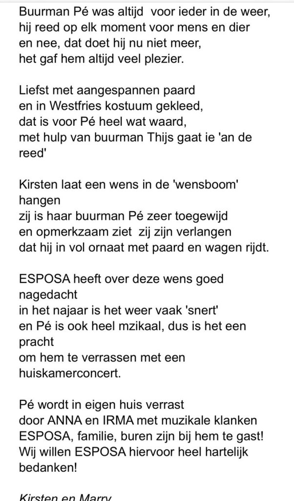 Bij deze een muzikale wens voor Pé en Thijs. Anna en Irma kwamen de heren met een privéconcert verrassen ’tussen de schuifdeuren’ in de voorkamer van Pé. Wat een gezellige wens was dit! Er werd fanatiek gedanst op heerlijke muziek. De wenser en Anna en Irma superbedankt!! Zonder jullie hadden we de wens niet zó mooi kunnen uitvoeren.