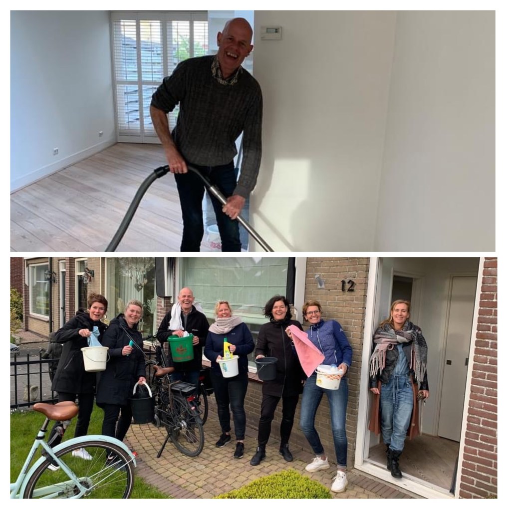 “Jong van geest op oude paden” helpen Judith Ursem met schoonmaken/verhuizen. Met z’n allen maken ze haar oude woning schoon. Ook Maf (Marco’s Afwerkingsfirma) kwam langs in haar nieuwe huis om te kijken wat hij voor haar kan doen. Dames en Gerrie, bedankt voor deze wens en jullie hulp! 🪣🧽🧹