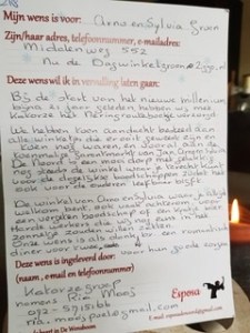 Wij willen u alvast laten weten dat u dit jaar de gelegenheid krijgt om uw diensten aan te bieden. Daarom ziet de wenskaart er dit jaar iets anders uit. U kunt op de achterkant een wens invullen, maar u kunt de kaart ook gebruiken als u een dienst wiltaanbieden. Schrijf hierop wat u in uw hoofd heeft, dan kijken wij of we uw dienst kunnen koppelen aan een wens van iemand anders.